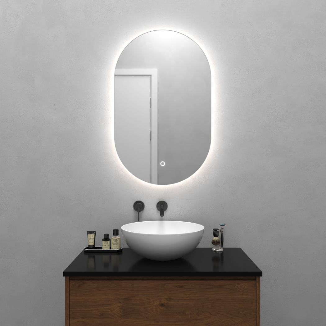 Безрамное зеркало овальной (капсульной) формы с контурной (тыльной) нейтральной подсветкой, свет 4000К. Подложка из высококачественного МДФ, светодиодная лента защищена матовым свето-рассеивателем от попадания пыли и влаги. Есть вывод 220W для подключения к сети, включение подсветки от сенсорной кнопки на зеркале.