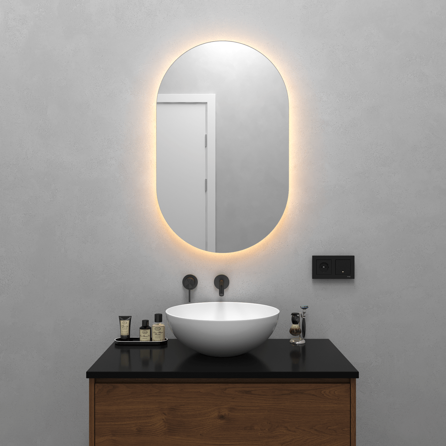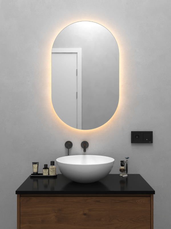 | Безрамное зеркало овальной (капсульной) формы с контурной (тыльной) тёплой подсветкой, свет 3000К. Подложка из высококачественного МДФ, светодиодная лента защищена матовым свето-рассеивателем от попадания пыли и влаги. Есть вывод 220W для подключения к сети, включение подсветки от выключателя на стене, либо от розетки. Возможно установить сенсорную кнопку на заказ в любом месте зеркала. |