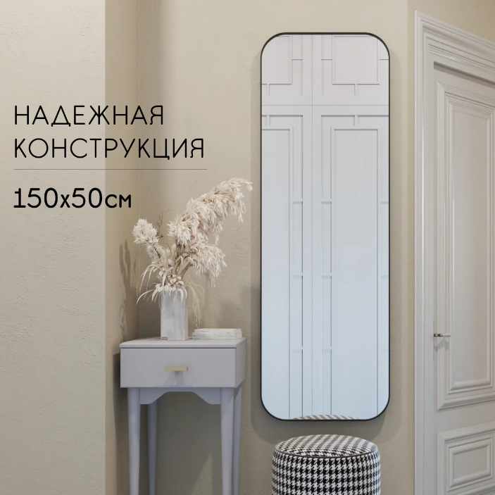 Зеркало «Evolve». Артикул GMZ-12-1/2/3 Эффектное настенное зеркало в тонкой металлической раме с закруглёнными углами можно с уверенностью назвать универсальным. Оно имеет прямоугольную форму и подходит как к классическим интерьерам, так и к современным. Крупный формат делает это зеркало функциональным с возможным размещением в помещениях различного назначения: спальне, ванной, гостиной, коридоре. Рама выполнена из высокопрочного металла, поэтому зеркало устойчивое и безопасное. Зеркальное полотно бельгийского производства, бренда AGC, продукция которого высоко ценятся во всём мире.Характеристики:– габаритные размеры – 1500х500х40 мм, металлический профиль тонкий – 4х40 мм, радиус закруглений – R100;